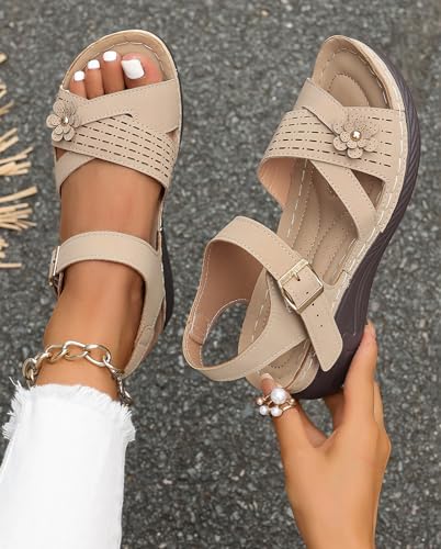 Women's Low Wedge Heels Summer Comfortable Dressy Platform Sandals Buckle Ankle Strap Open Toe Flower Wedge Sandals